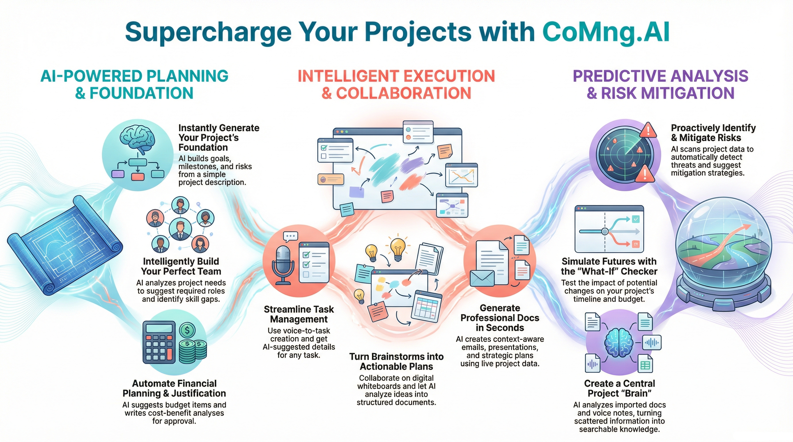 Traditional project management is reactive—problems appear, then you scramble. CoMng.AI is proactive: