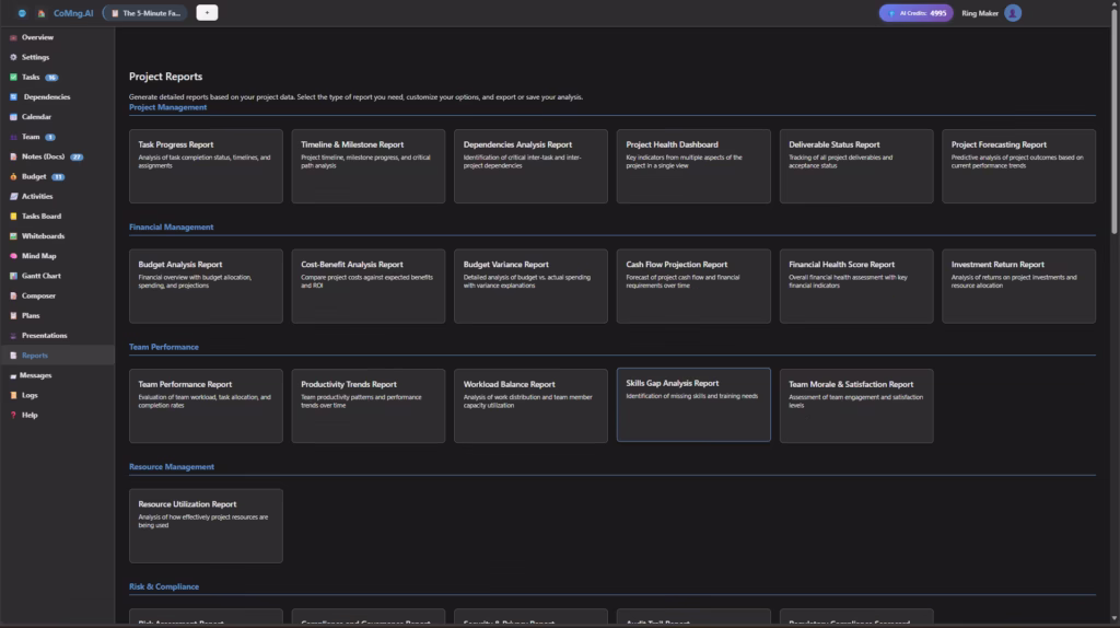Step 1: Create and Update Your Project Foundation with CoMng.AI’s AI Capabilities (15-20 minutes) Use CoMng.AI to build and continuously refine your project foundation. Leverage its AI capabilities to organize tasks, set priorities, and keep your project information up to date, ensuring your team stays aligned and productive throughout the project lifecycle.